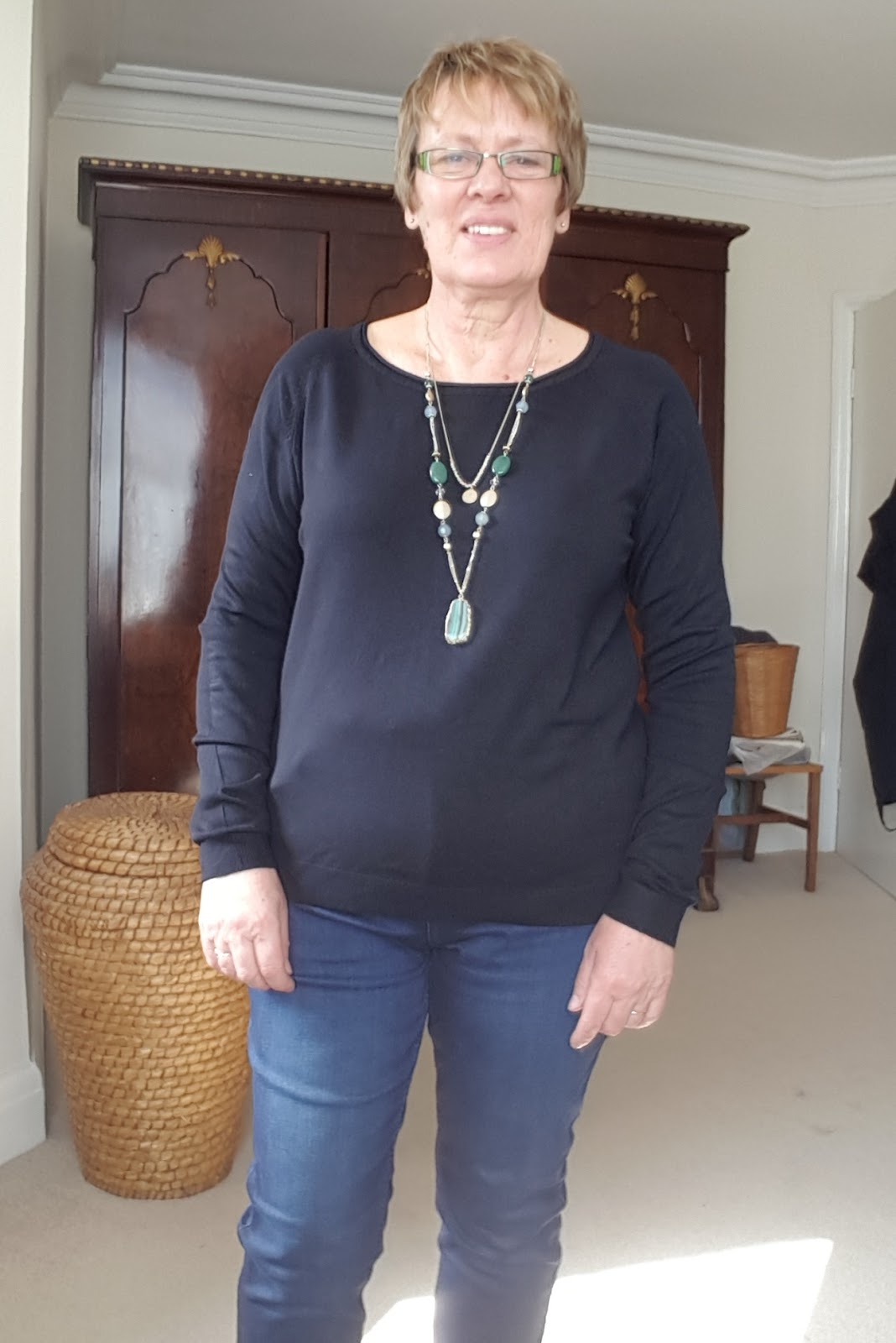 Day 5: Half way through! Black jumper over blue jeans, accessorized with long gold and green necklace. Very comfortable combination.